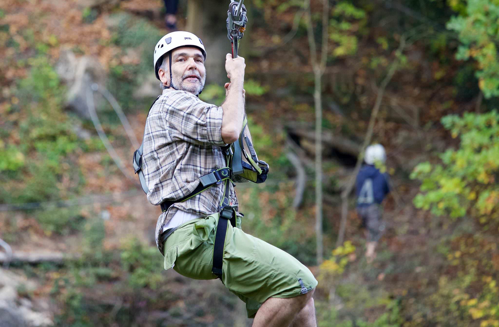 Een gave klettersteigroute met staalkabels en beugels. Onderweg kom je verschillende obstakels tegen, zoals bruggen en trappetjes en zelfs 2 x een ravijnoversteek met een zipline. MEER INFO